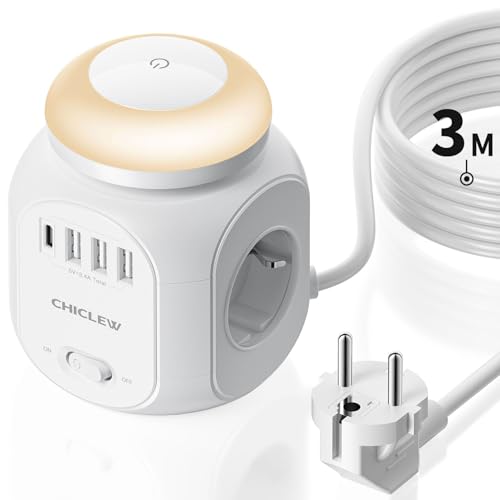 CHICLEW Multiprise USB Cube, Rallonge Multiprise 3M avec 4 Prises, 3 USB et 1 Type-C, 8 en 1 Prise Multiple avec Veilleuse LED, Protection Contre Les surtensions avec Interrupteur pour Bureau Maison
