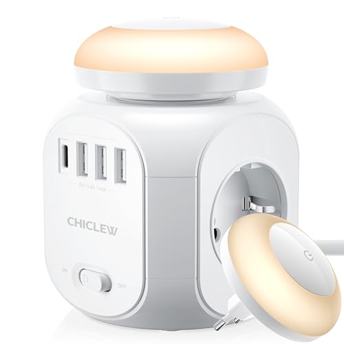 CHICLEW Multiprises Parafoudre avec USB, Cube Multiprise Electrique avec 4 Prises, 3 Ports USB et 1 Port Type-C, Prise Electrique avec 1,8 m de Rallonge et Veilleuse LED pour Bureau Maison Voyages