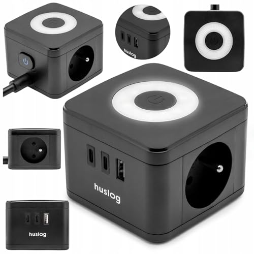 Huslog Bloc Multiprise Cube 5-in-1 avec 2 Prises, 1 USB & 2 USB-C, 230V/16A, Câble 1,4 m, LED Dimmable, Antidérapant et Compact pour Maison & Bureau, Noir