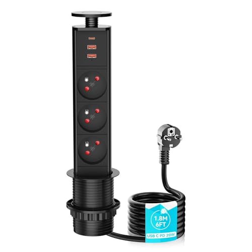 BuyWeek Prise Encastrable Plan de Travail Prise Plan de Travail Cuisine Prise Escamotable Multiprise Bureau avec Connecteurs USB et Type-C Charge Rapide 18W (Noir, 1,8m)