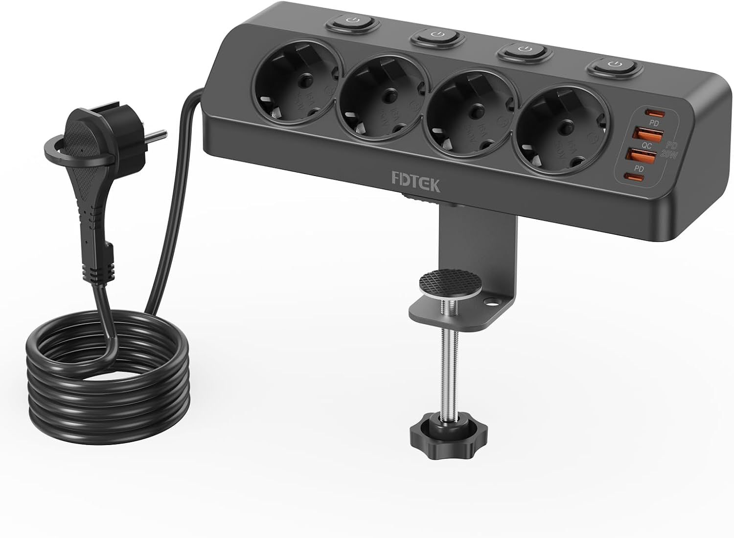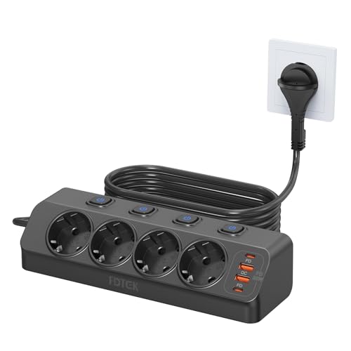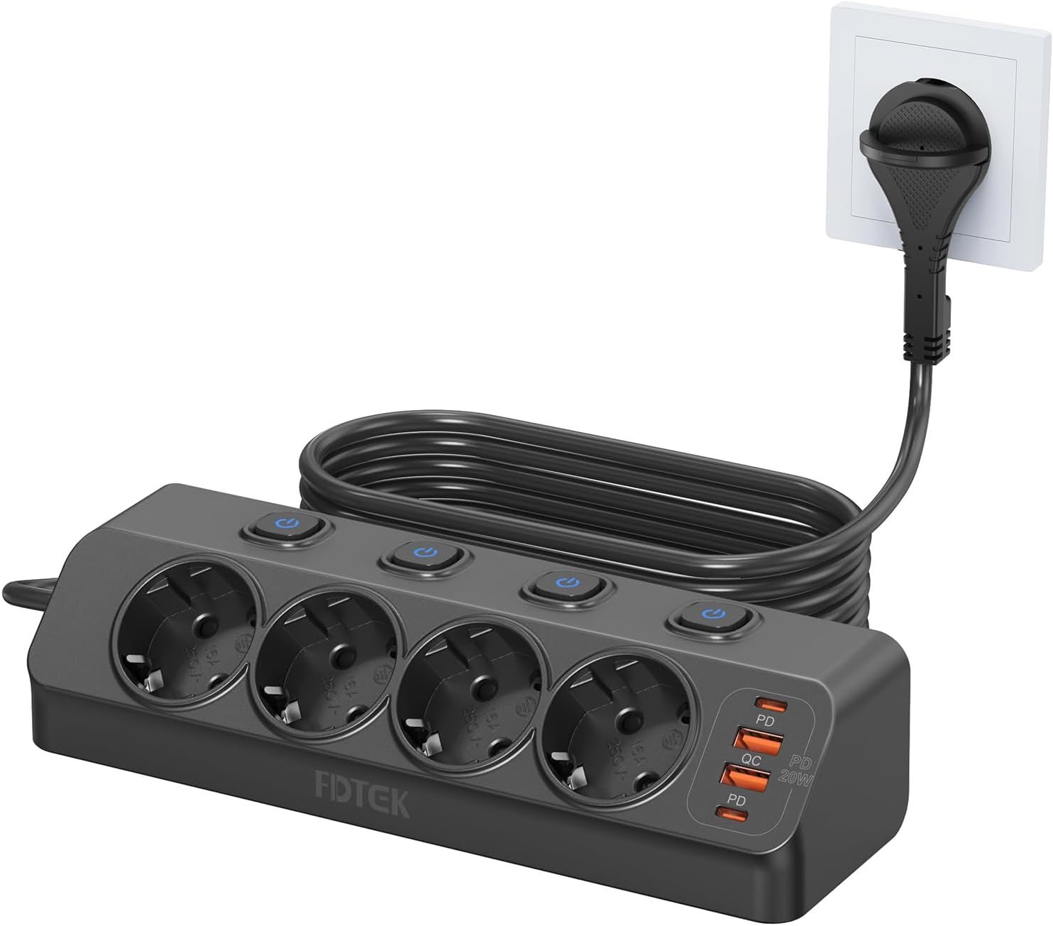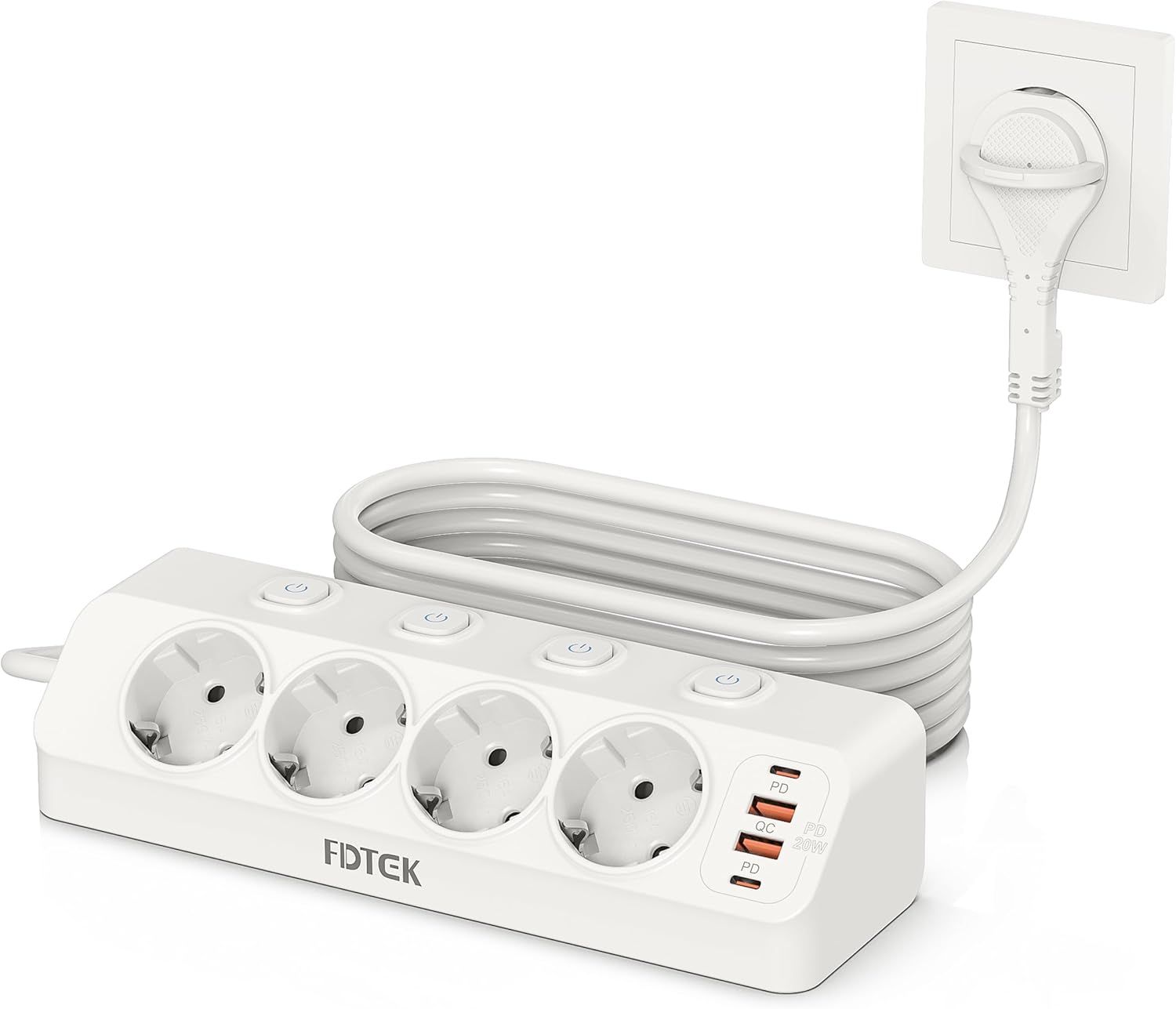 FDTEK PD 20W Prise de Table avec USB C, Multiprise de Bureau avec Interrupteur Individuel, Prise d'angle 4 Prises avec 4 USB, Multiprise Fiche Plate pour Bureau et Maison, 2M Câble
