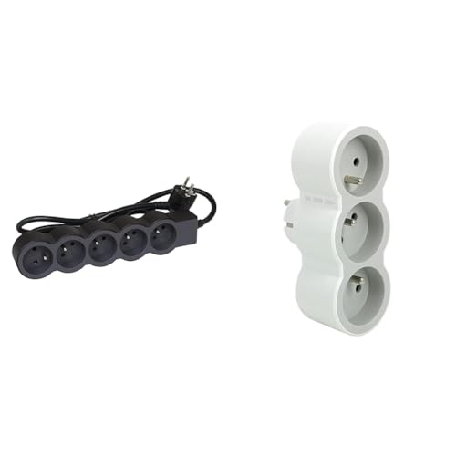 LEGRAND - Multiprise Extra-Plate - 5 Prises de Courant avec Terre - avec Cordon 1,5 m - Noir et Gris & Fiche Multiprise Triplite - 3 Prises Frontales avec Terre - Positionnement Horizontal