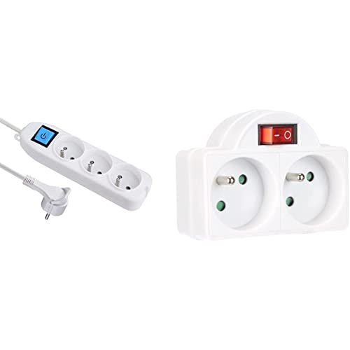 Electraline 32040 Bloc 3 Prises avec Interrupteur/fiche Plate 1,5 m Blanc & 531192 Adapteur Fiche Multiprise Biplite avec Interrupteur 2 Prise 16A, Blanc