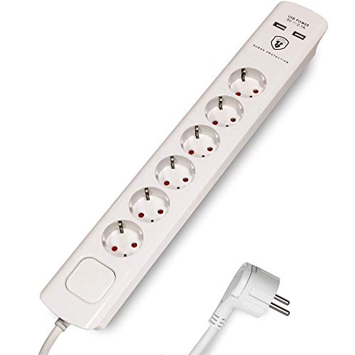 FeinTech MD000633 Multiprise avec USB et fiche plate, 6 prises avec interrupteur, parasurtenseur et câble de 3 m