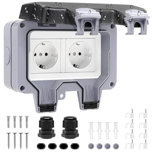 Prise Exterieure Etanche IP66 Prise de Courant et Volet de Protection Double Prise Electrique Multiprise Murale pour Jardin, Garage, Piscine Cuisine, Salle de Bain