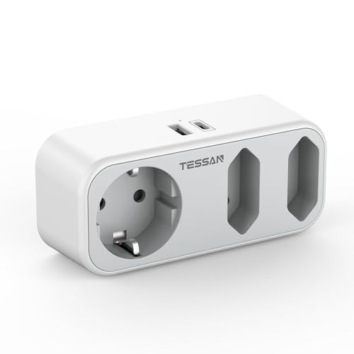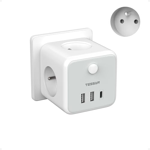 TESSAN 5 en 1 Prise Multiple USB 3 Sortie AC avec 2 USB, Multiprise Murale 3600W, Triplette Electrique Compatible pour Phone et Électroménager, Gris
