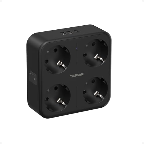 TESSAN Multiprise Murale 4 Prises, Prise Multiple avec 1 USB C et 2 USB A, Adaptateur Secteur avec Interrupteur pour Domicile, Bureau, Compatible avec Phone, Pad, Noire