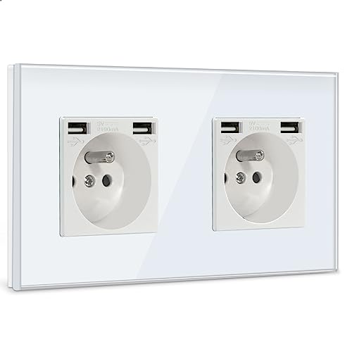 BSEED Double Prise Murale avec 2 Ports USB,16A Prise de Courant Alternatif avec Panneau en Verre,Multiprise Murale Max 2.1A,Convient au Smartphone, à la Tablette (2 Prise avec 2 Ports USB,Blanc)