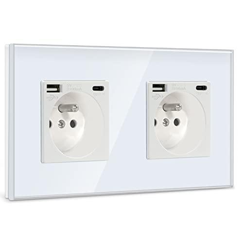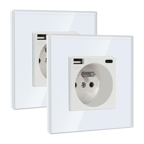 BSEED Prise Murale avec USB et 1 Type C,16A Prise de Courant Alternatif avec Panneau en Verre,Multiprise Murale Max 2.1A,Convient au Smartphone, à la Tablette (Blanc)