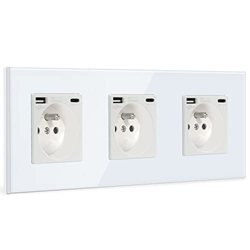 BSEED Triple Prise Murale avec USB et 1 Type C,16A Prise de Courant Alternatif avec Panneau en Verre,Multiprise Murale Max 2.1A,Convient au Smartphone, à la Tablette (3 Prise avec USB et Type C,Blanc)
