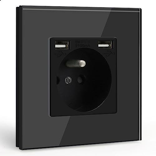 BSEED Prise Murale avec 2 Ports USB,16A Prise de Courant Alternatif avec Panneau en Verre,Multiprise Murale Max 2.1A,Convient au Smartphone, à la Tablette (1 Prise avec 2 Ports USB,Noir)