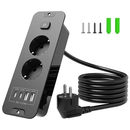 Inhwatek Multiprise Encastrable avec Interrupteur, 3 Prises avec 2 USB-A et 2USB-C (PD 20W), Multiprise Parafoudre et Surtension avec Câble de 2 m, pour Maison Bureau, Noir 16A/4000W
