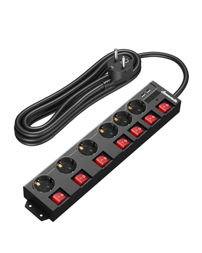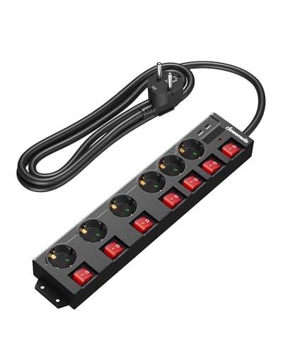 DEWENWILS Multiprise avec 6 Prises & 2 USB & 7 Interrupteurs Individuel, 3680W Max, Montage Mural, Sécurité Enfants, Rallonge Multiprise Parafoudre et Surtension avec Câble 5M, Noir