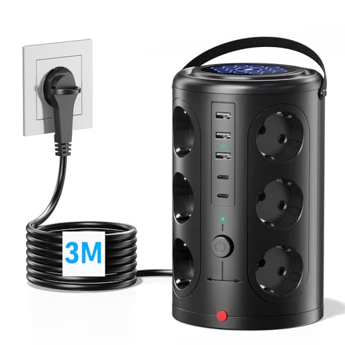Pluackg Tour Multiprise avec Interrupteur, Multiprise Parafoudre et Surtension 5 Ports USB et 12 Prises pour Maison, Bureau, Noir,3M Cordon