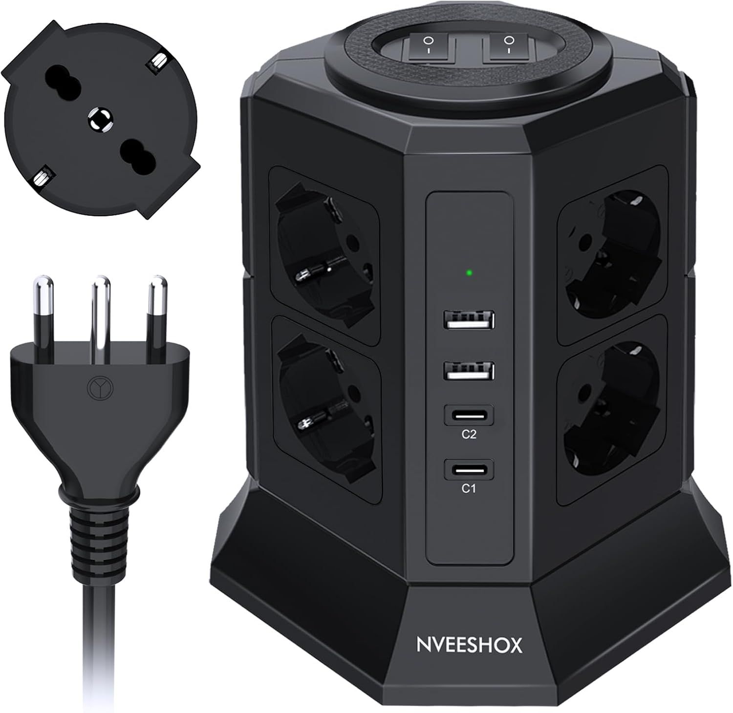 NVEESHOX Bloc multiprise avec 8 prises universelles Schuko (4000 W 10/16 A) et 2 USB-C (20 W PD3.0) et 2 USB-A, IT Multiprise verticale avec interrupteur avec interrupteur, câble 2 M (Noir)