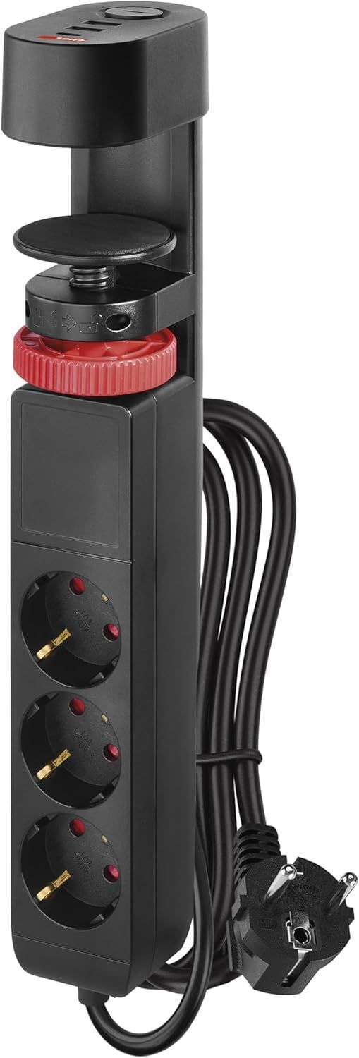 EMOS - Multiprise Verticale 3 Prises avec USB (2X USB-A, 1x USB-C), Charge Rapide, câble 1,5m, Pince de Table, Interrupteur, Protection renforcée Contre Les Contacts accidentels - intérieur - Noir