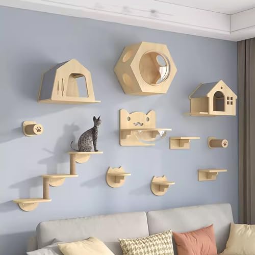 QLS Mur d'escalade pour chat avec 2 ponts et 3 chaises longues en bois, montage au plafond, réglable