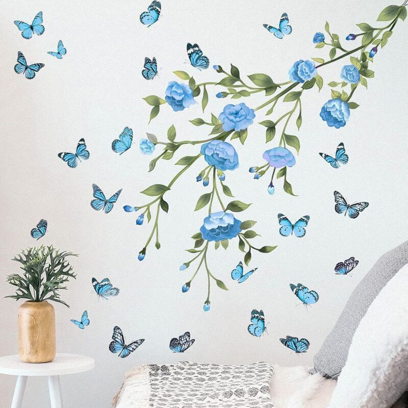 Vtizikl Bleu Plante Papillon décoration Mur Autocollant PVC Auto-adhésif Maison Chambre décoration Murale Peut être enlevé