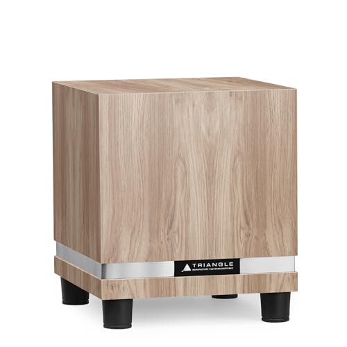 Triangle – Caisson de Basses THETIS 300 avec Amplificateur 150W – Bass Reflex - Haut-Parleur 20cm – Entrées RCA/LFE/Haut Niveau - Télécommande - Musique et Home-Cinéma - 300x340x300 mm - Chêne Clair