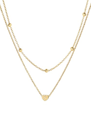 FOCALOOK Collier Femme Lettre N Plaqué Or, Chaîne Double Couche avec Pendentif Coeur Initiale Minuscule Acier Inoxydable Doré