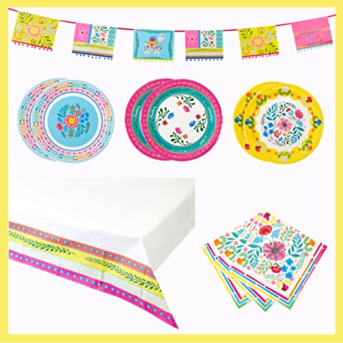 Talking Tables Fournitures de fête Boho pour 12 invités – Comprend assiettes florales colorées, guirlande, nappe en papier | Idéal pour un anniversaire sur le thème d'Encanto, un barbecue d'été
