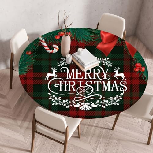 Odot Noël Rouge Nappe de Table Ronde en Anti Tache Intérieur Couverture de Table avec Bord Élastique Nappes Rondes Lavable pour Cuisine Jardin Décoration (Joyeux Noël,120cm)