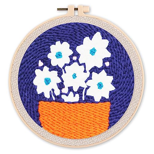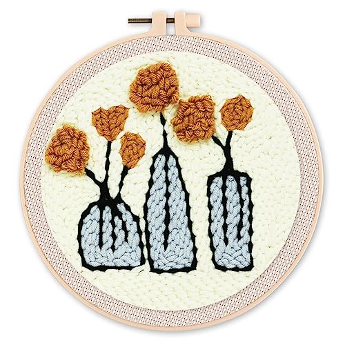 Figured'Art Punch Needle Kit Complet pour Adultes et Enfants - Fleurs et Vases - Parfait pour Débutant. Set prêt à broder taille 20x20cm avec cadre circulaire