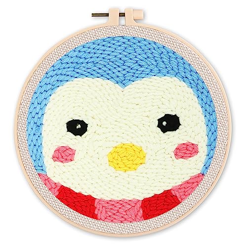 Figured'Art Punch Needle Kit Complet pour Adultes et Enfants - Pingouin - Parfait pour Débutant. Set prêt à broder taille 20x20cm avec cadre circulaire