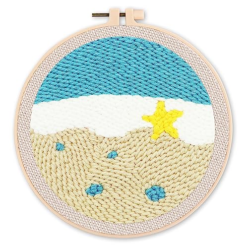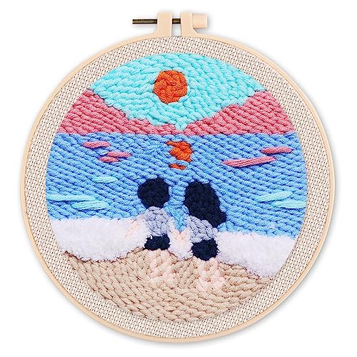 Figured'Art Punch Needle Kit Complet pour Adultes et Enfants - À la Plage - Parfait pour Débutant. Set prêt à broder taille 20x20cm avec cadre circulaire