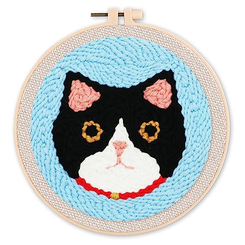 Figured'Art Punch Needle Kit Complet pour Adultes et Enfants - Chat aux Grandes Moustaches - Parfait pour Débutant. Set prêt à broder taille 20x20cm avec cadre circulaire