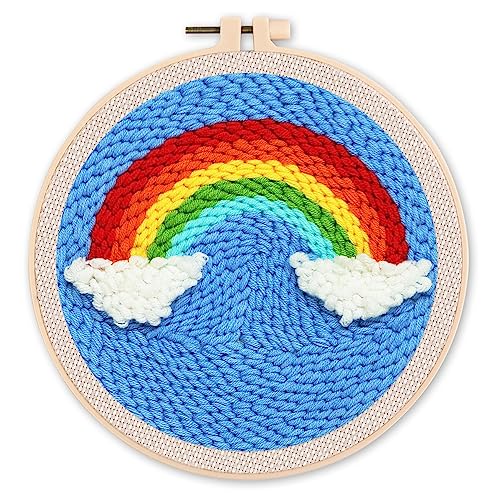 Figured'Art Punch Needle Kit Complet pour Adultes et Enfants - Arc en Ciel et Nuages - Parfait pour Débutant. Set prêt à broder taille 20x20cm avec cadre circulaire