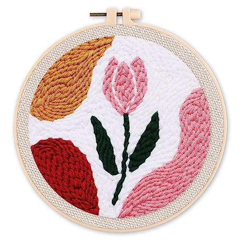 Figured'Art Punch Needle Kit Complet pour Adultes et Enfants - Tulipe Prête à Éclore - Parfait pour Débutant. Set prêt à broder taille 20x20cm avec cadre circulaire