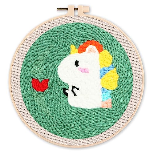 Figured'Art Punch Needle Kit Complet pour Adultes et Enfants - Licorne et Arc en Ciel - Parfait pour Débutant. Set prêt à broder taille 20x20cm avec cadre circulaire
