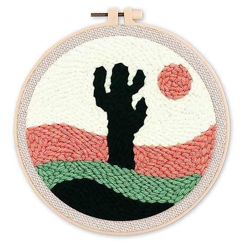 Figured'Art Punch Needle Kit Complet pour Adultes et Enfants - Cactus dans le Désert - Parfait pour Débutant. Set prêt à broder taille 20x20cm avec cadre circulaire