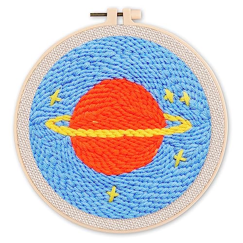 Figured'Art Punch Needle Kit Complet pour Adultes et Enfants - Planète Saturne - Parfait pour Débutant. Set prêt à broder taille 20x20cm avec cadre circulaire