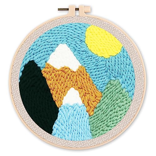 Figured'Art Punch Needle Kit Complet pour Adultes et Enfants - Montagnes Enneigées et Soleil - Parfait pour Débutant. Set prêt à broder taille 20x20cm avec cadre circulaire