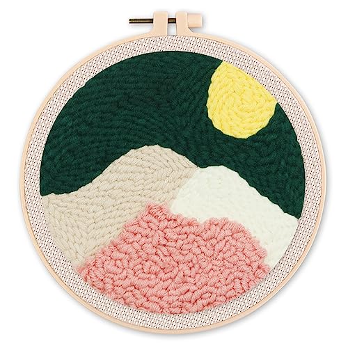 Figured'Art Punch Needle Kit Complet pour Adultes et Enfants - Montagne et Coucher de Soleil - Parfait pour Débutant. Set prêt à broder taille 20x20cm avec cadre circulaire