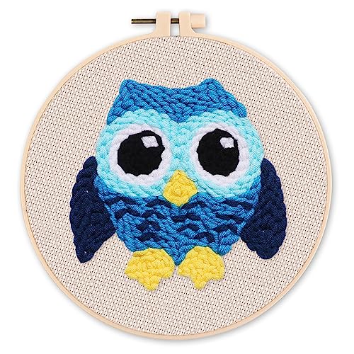 Figured'Art Punch Needle Kit Complet pour Adultes et Enfants - Chouette Bleue - Parfait pour Débutant. Set prêt à broder taille 20x20cm avec cadre circulaire