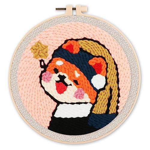 Figured'Art Punch Needle Kit Complet pour Adultes et Enfants - Chien Shiba Inu - Parfait pour Débutant. Set prêt à broder taille 20x20cm avec cadre circulaire