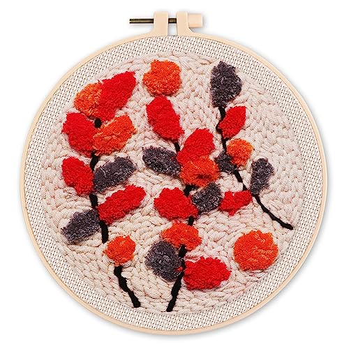 Figured'Art Punch Needle Kit Complet pour Adultes et Enfants - Branches Colorées sur Fond Beige - Parfait pour Débutant. Set prêt à broder taille 20x20cm avec cadre circulaire