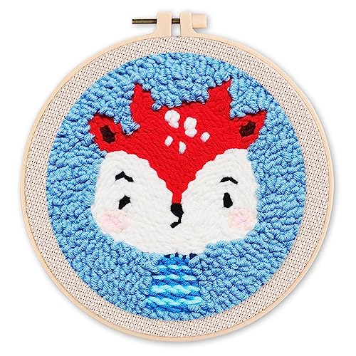 Figured'Art Punch Needle Kit Complet pour Adultes et Enfants - Petit Renard et Ciel Bleu - Parfait pour Débutant. Set prêt à broder taille 20x20cm avec cadre circulaire