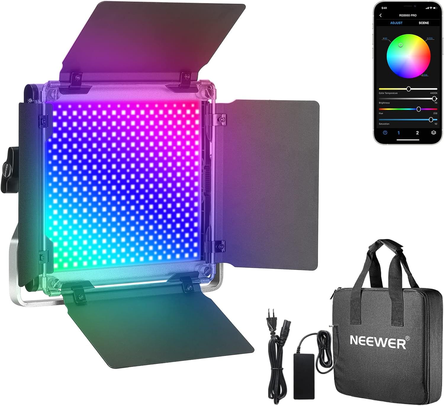 NEEWER 660PRO RGB LED Lumière Vidéo avec Contrôle APP, 50W Éclairage Vidéo 360 ° Polychrome, CRI 97 avec Support Barndoor/U pour Streaming, Youtube, Webex, Diffusion, Conférence Web, Photographie