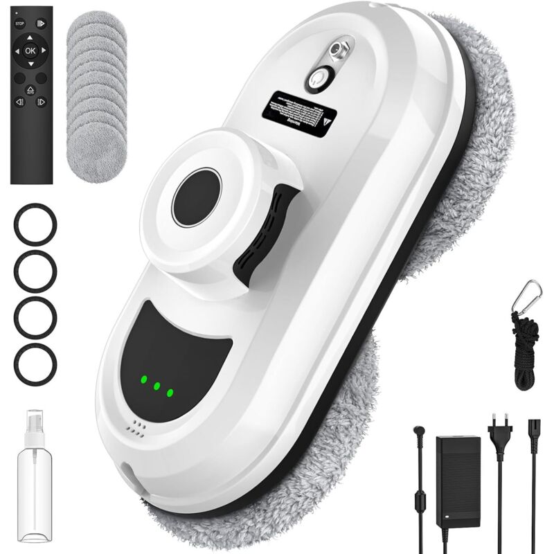 (Blanc)Robot Laveur Vitre Electrique 5600Pa - Fonction de Pulvérisation d'eau - 3 Modes, Télécommande et 10 Chiffons de Nettoyage