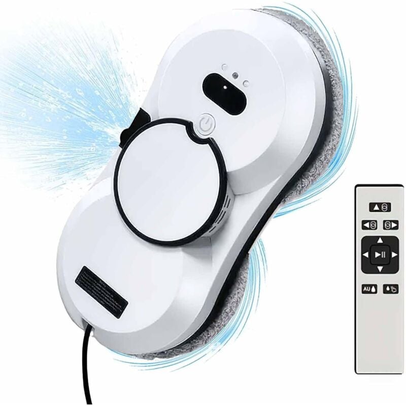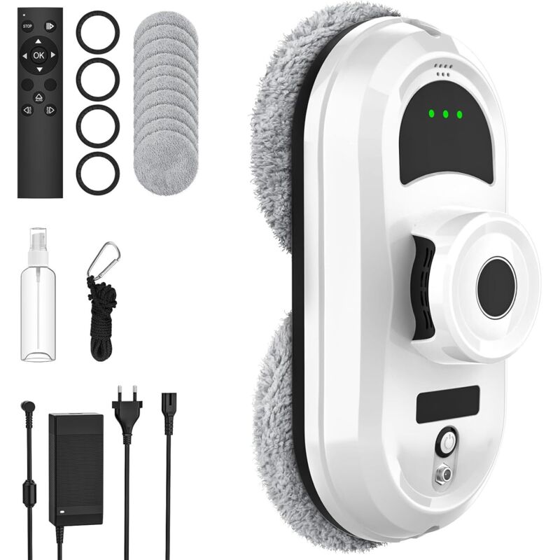 Robot Nettoyeur de Vitre, Robot Laveur de Vitre Automatique avec Pulvérisation d'eau, Corde de sécurité, télécommande et 10 Chiffons de Nettoyage,
