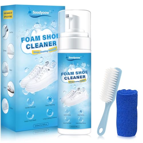 soodyoow Nettoyant Chaussure, Kit Nettoyage Chaussure 200 ml, Nettoyant Sneakers avec Brosse et Serviette, Mousse de Nettoyant Chaussure Adapté aux Chaussures en Cuir, Toile, Tricot, Bottes