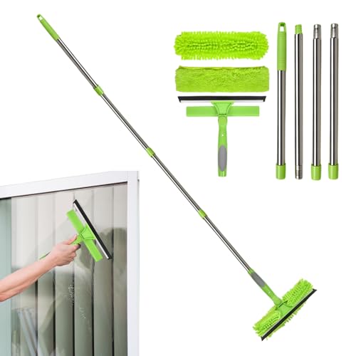 Vibrivio Nettoyeur de vitres avec tige télescopique, kit de nettoyage de vitres 4 en 1 avec tête de brosse rotative, raclette et plumeau pour verre, miroir, carrelage, fenêtre de voiture et panneaux