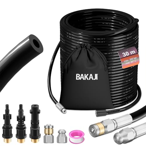 BAKAJI Sonde de purgeur de tuyau haute pression 200 bar, système anti-pli avec étui, 3 adaptateurs, 2 buses fixes et rotatives, compatible avec nettoyeur haute pression Kärcher k2-k7 LAVOR (30 mètres
