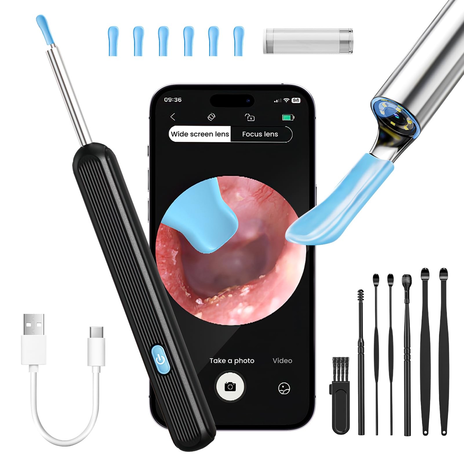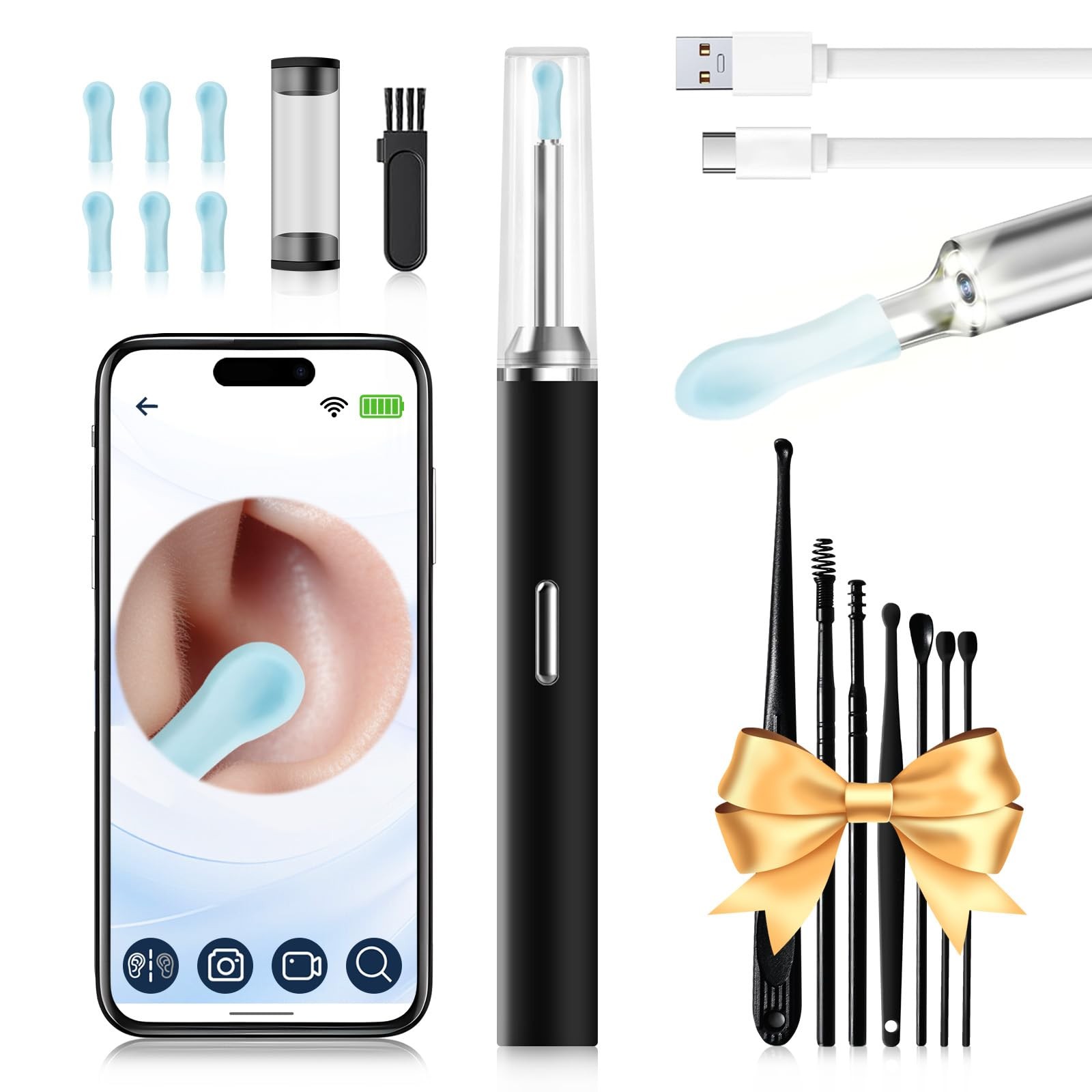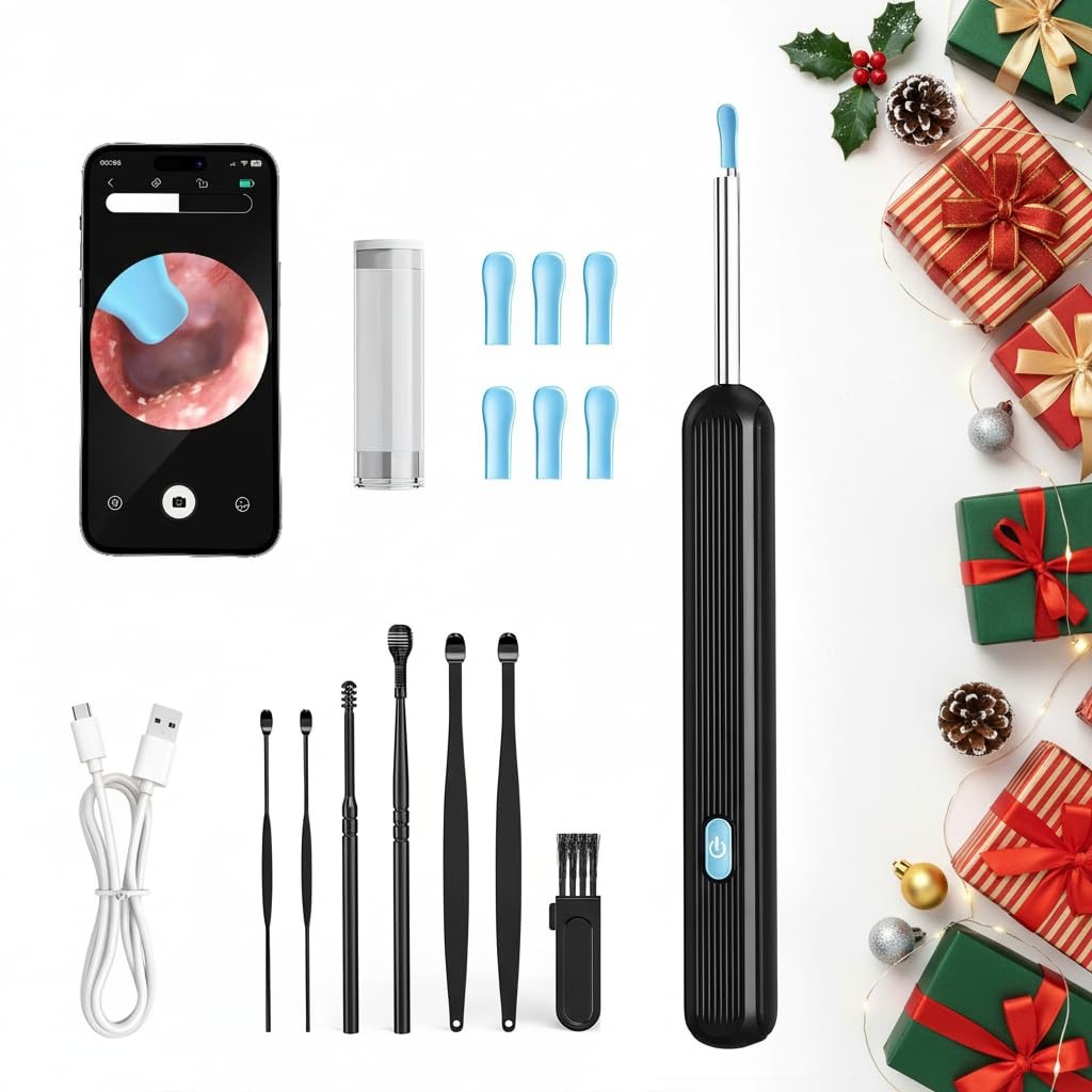 Nettoyeur d'oreille visuel intelligent avec caméra 1296P, bâtons d'oreille, chargement USB C, outil de suppression d'avertissement d'oreille, connexion WiFi, 6 lumières LED, cure-oreille