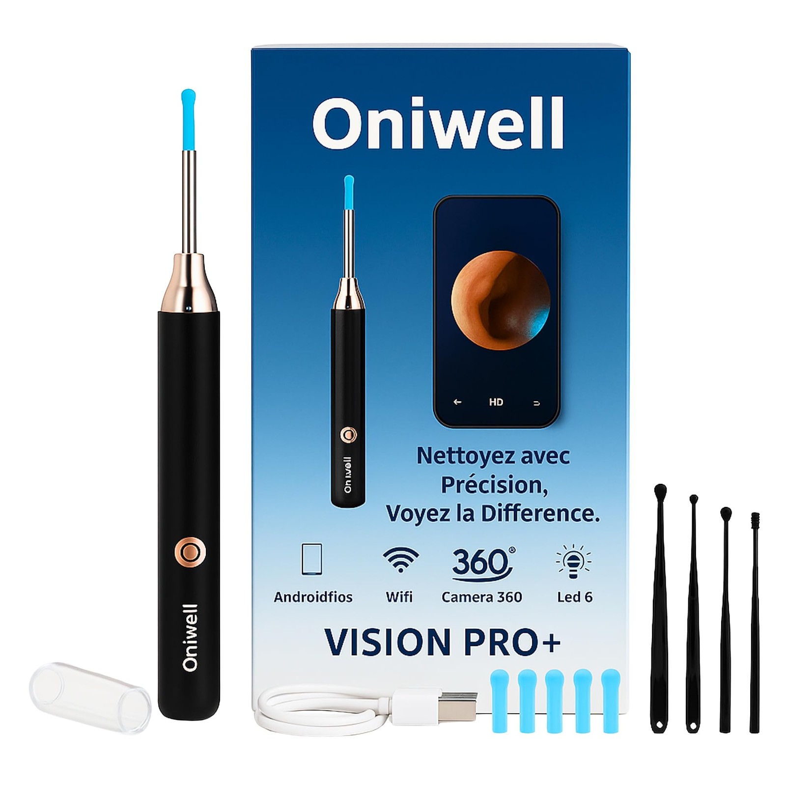 Otoscope Oreille, Nettoyeur Oreille WIFI avec 6 Lumières LED, Nettoyage Camer...