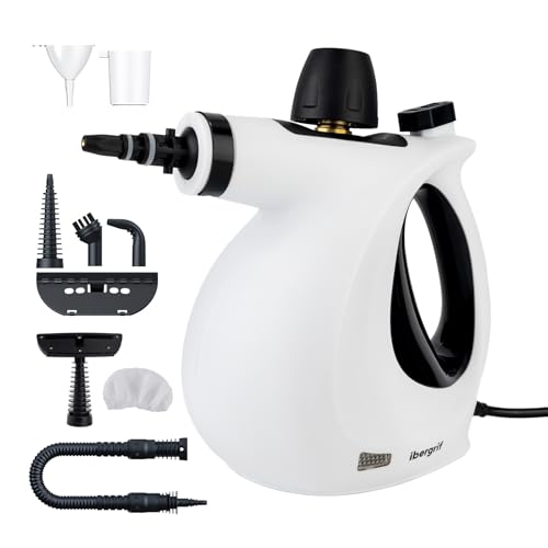Ibergrif Nettoyeur Vapeur Portatif, 1050W avec 9 Accessoires, 3 Bar Haute Pression, Solution Sans Produits Chimiques, pour Canapé, Cuisine, Joints et Vitres, 350ml, Blanc